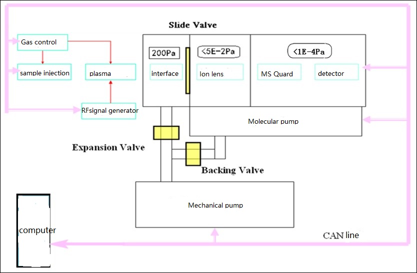 The ICP-MS 1000 mainly includes the following functional modules: a sample injection system, an ICP ion source, an interface unit, a ion transport system, a four-stage pole quality analysis system, an ion detection and data acquisition system, a vacuum system, a complete machine control system and a software system.